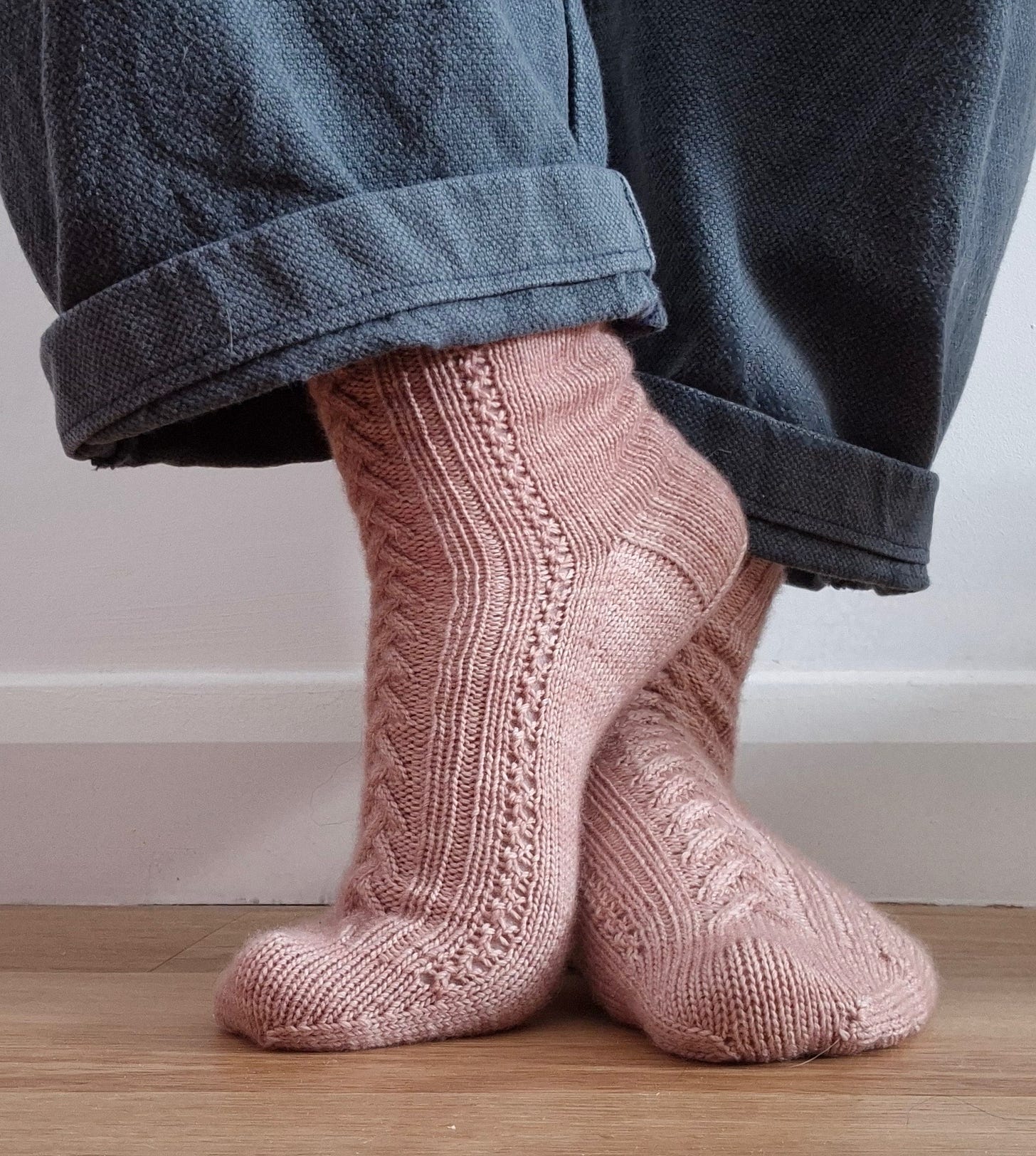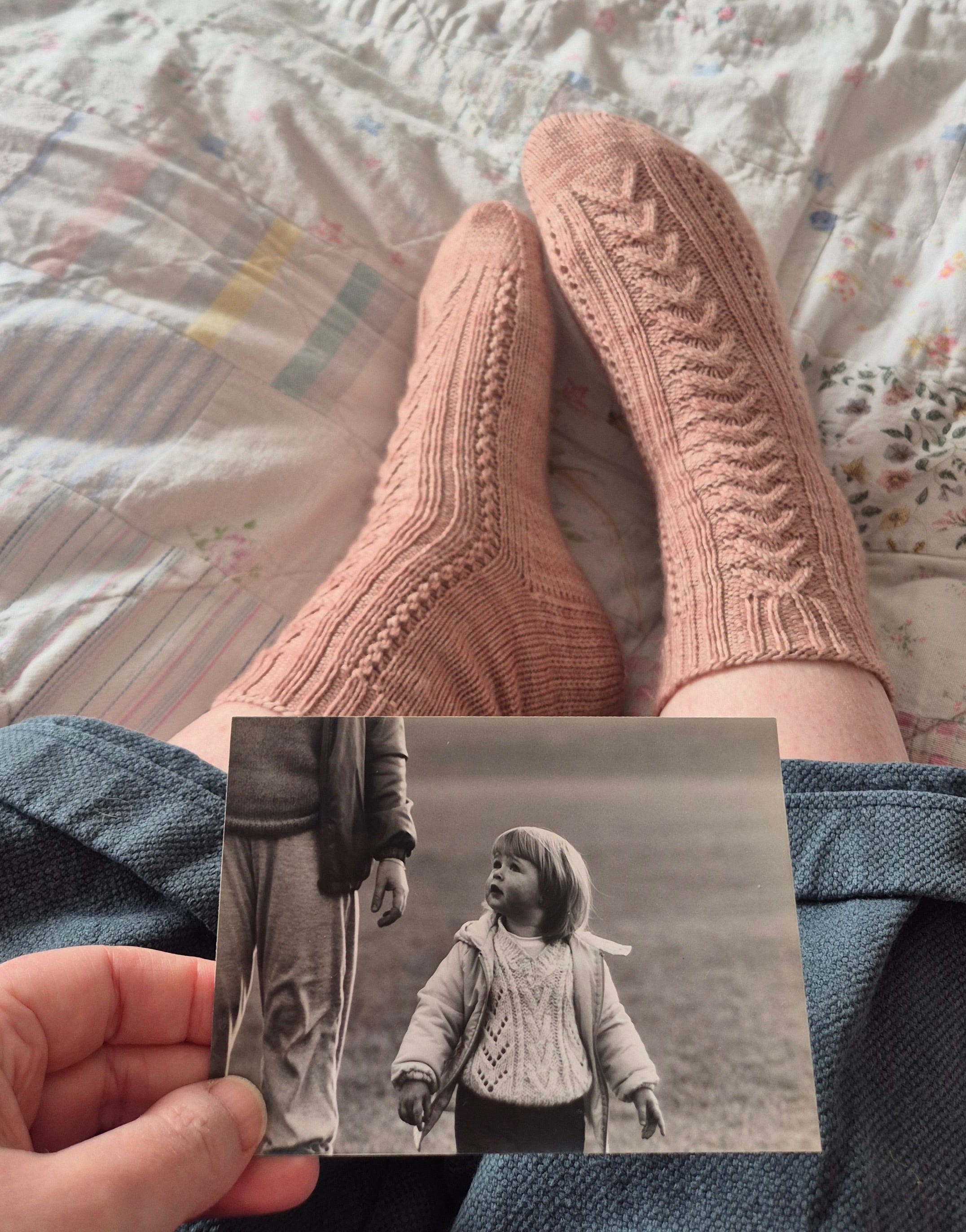 So I designed Lovelight, a sock pattern inspired by that little jumper. Delicate lace combines with gentle cables to echo it’s texture. The stitches aren't identical, but for me the feeling is.